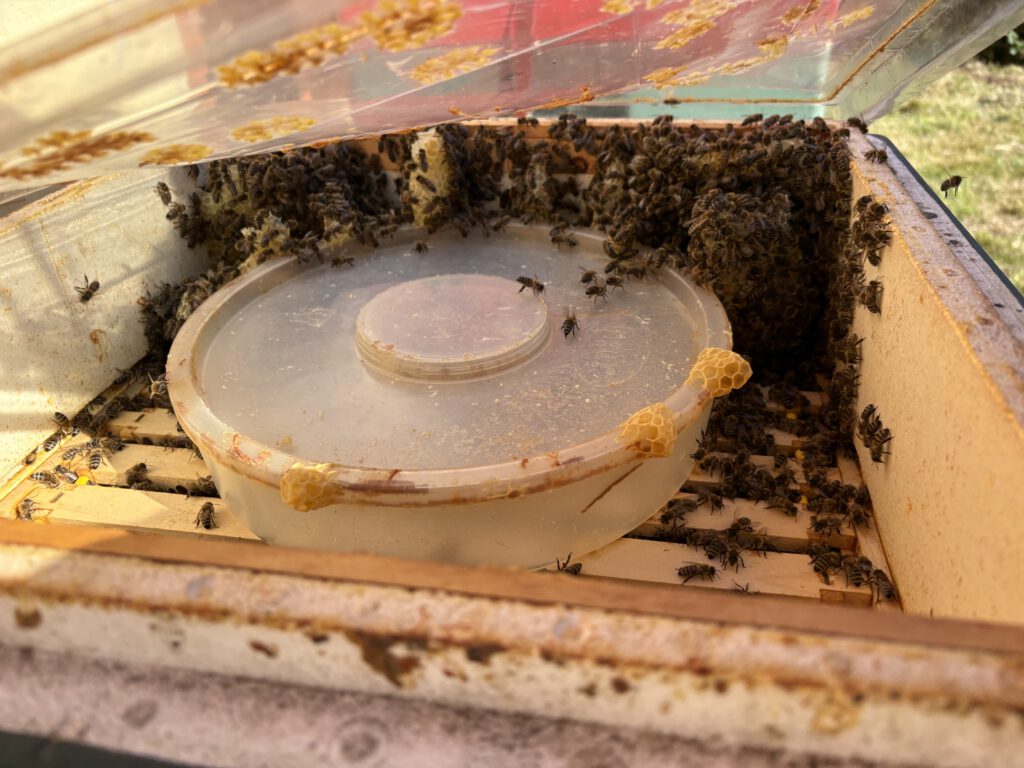 Als erstes mussten wir kontrollieren, ob unsere Völker stark genug für den bevorstehenden Winter sind und haben fleißig eingefüttert. Dabei testeten wir verschiedene Futterkonstruktionen und konnten mal wieder wunderbar beobachten, was für Kunstwerke Bienen bauen, wenn man ihnen nicht durch Rähmchen die Richtung vorgibt.