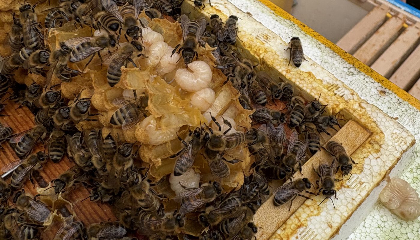 Als erstes mussten wir kontrollieren, ob unsere Völker stark genug für den bevorstehenden Winter sind und haben fleißig eingefüttert. Dabei testeten wir verschiedene Futterkonstruktionen und konnten mal wieder wunderbar beobachten, was für Kunstwerke Bienen bauen, wenn man ihnen nicht durch Rähmchen die Richtung vorgibt.